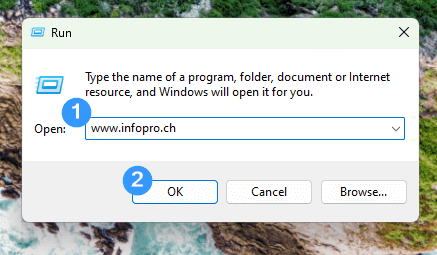 2. Nun öffnet sich Ausführen, gebe nun dort www.infopro.ch dann auf OK oder Enter.